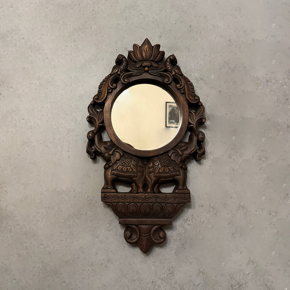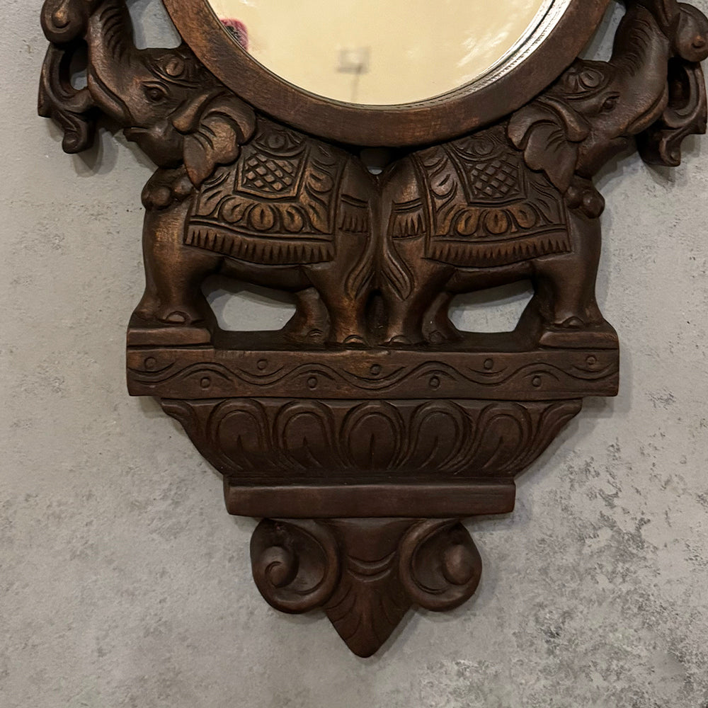 This lovely mirror is an exquisite, hand-carved wall piece featuring a round mirror set within a richly detailed wooden frame. Twin elephants, adorned with traditional motifs, form the base of the design, while a lotus and decorative scrollwork crown the top, reflecting classic Indian artistry and cultural symbolism. Ideal for entryways, living rooms, or heritage-inspired interiors, this mirror serves as a striking accent that adds warmth, history, and royal elegance to any space.